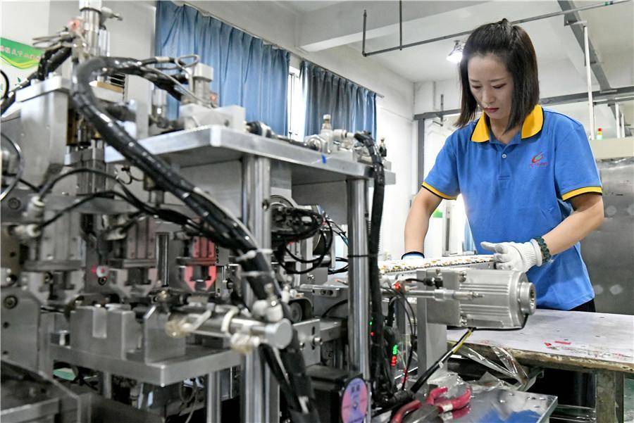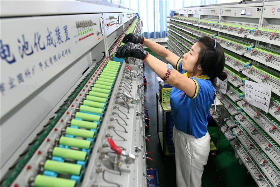 工人进行锂离子电池生产。